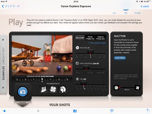 Play | Canon Explains Exposure Canonのサイト。絞り、シャッタースピード、ISO 感度の関係を実感できる。 PLAY をクリックすると以下のようなページに。 各値をいじり左下の青いボタンを押すとどんな感じの写真になるかが表示される。 各値を変えられるだ…